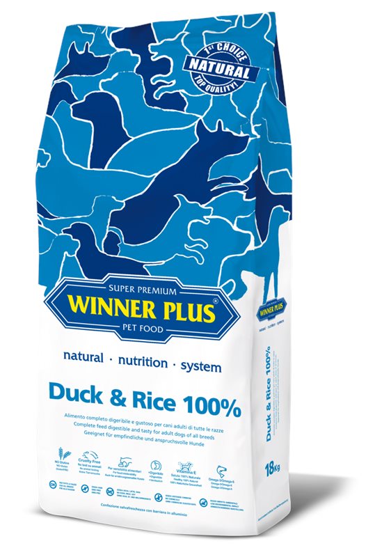 WINNER PLUS Duck & Rice הוא מזון שלם, 100% טבעי וקל מאוד לעיכול.